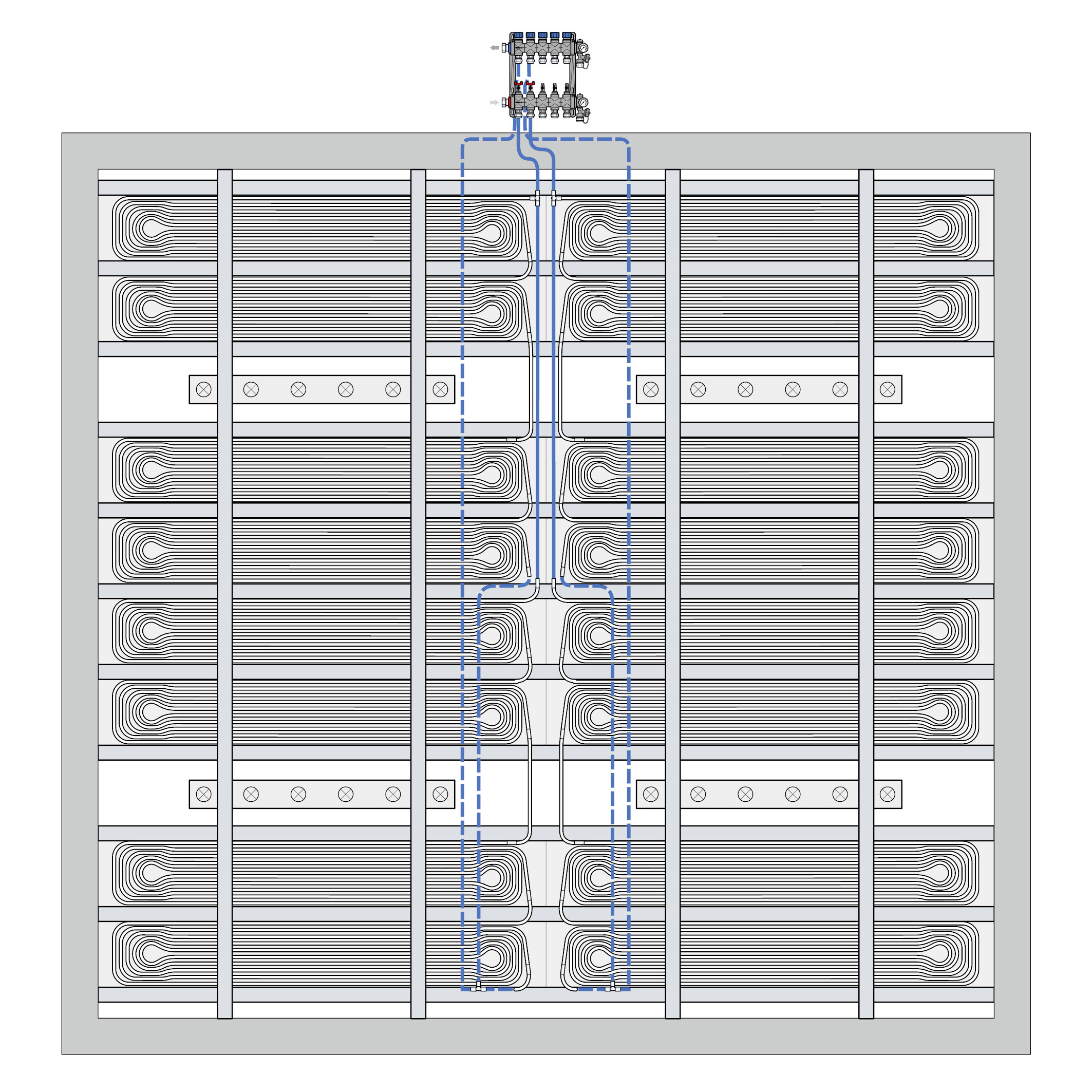 Wie er die einzelnen Elemente einer Kühldecke dabei intern hydraulisch verschaltet, hängt von mehreren Faktoren ab: Raumgeometrie, die räumliche Verteilung der thermischen Lasten sowie Art und Ort von Deckeneinbauten spielen genauso eine Rolle wie Volumenströme und maximal zulässige Druckverluste oder das Regelungskonzept.