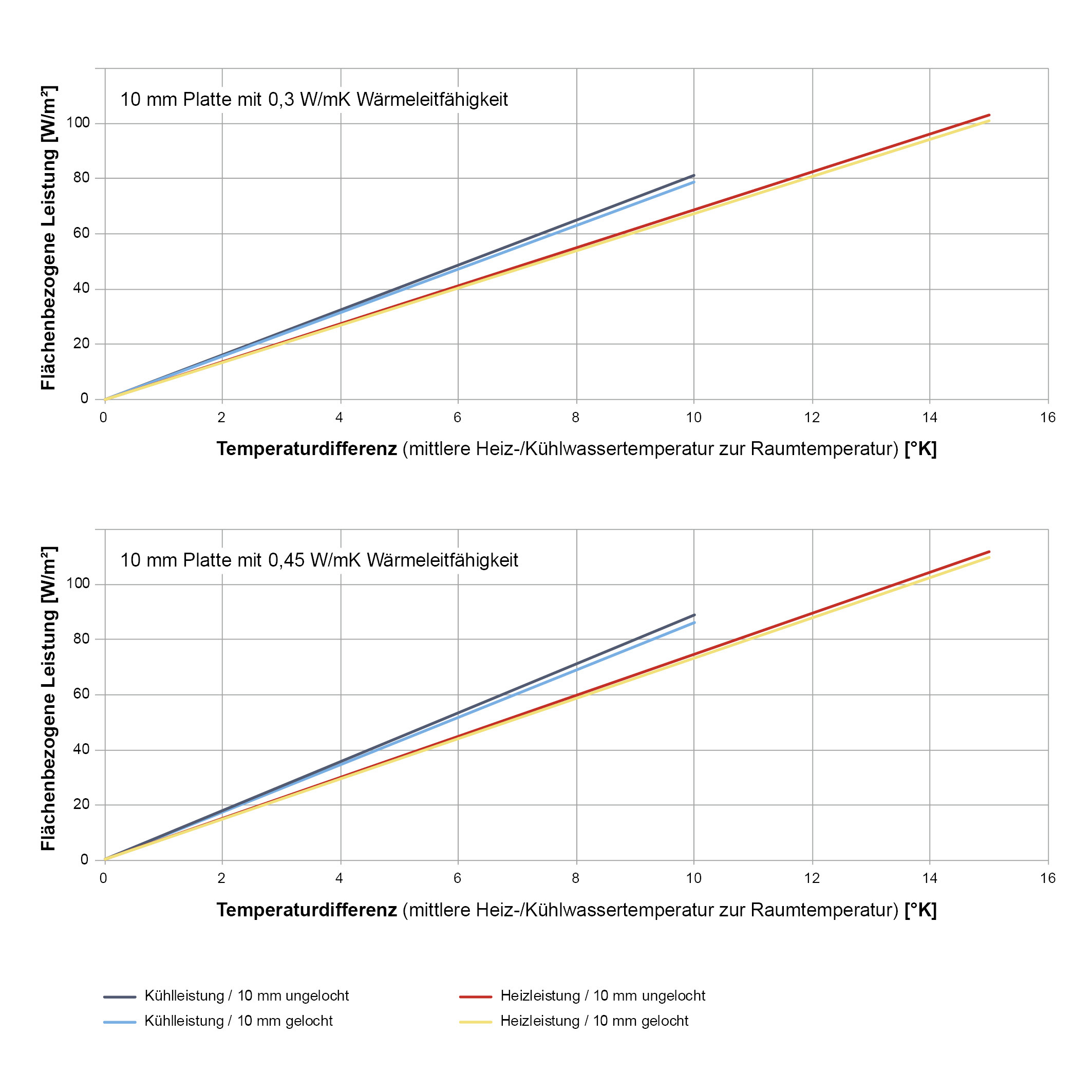 Durch den Aufbau des Systems ergäbe sich eine Plattenfläche von z. B. 10,5 m2. Damit müssen für die Dimensionierung des Systems dann 62,5 W/m2 * 8 m2 / 10,5 m2 = 47,6 W/m2 angesetzt werden. Die tatsächliche Kühlleistung ist also geringer, als die angegebene Nennkühlleistung zunächst vermuten lässt. Bei Raumkühlflächen aus Gipskarton kann die nach VDI 6034 ermittelte Nennkühlleistung hingegen direkt verwendet werden.