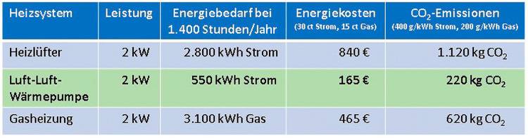 Dadurch, dass Wärmepumpen im Heizbetrieb Wärme aus der Umgebung nutzen, arbeiten sie sehr energieeffizient. ITG Dresden hat in einer Untersuchung den Strombedarf für den Betrieb der Luft-Luft-Wärmepumpe der Einsparung an Gas (jeweils Endenergie) gegenübergestellt. Betrachtet wurden ein Referenz-Einfamilienhaus und Referenz-Bürogebäude.