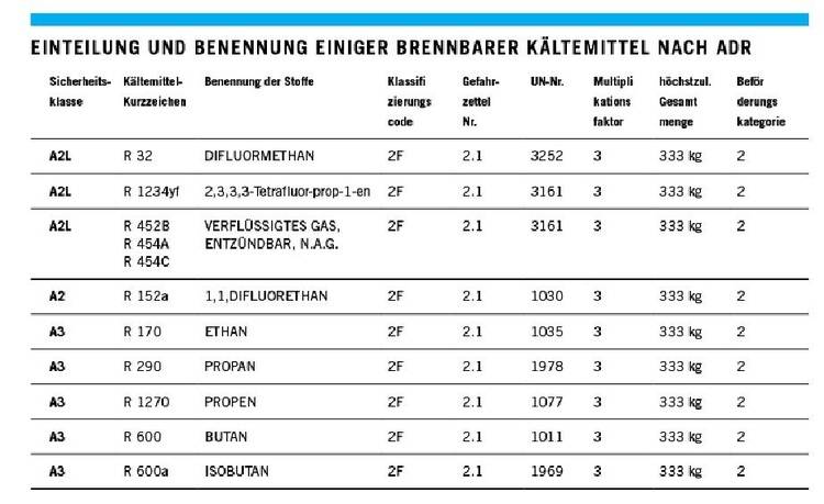 Allerdings haben die üblichen brennbaren Kältemittel den Klassifizierungscode 2 F (brennbar) und einen Multiplikationsfaktor 3. Praktisch bedeutet das, wenn ausschließlich eine Kältemittelsorte transportiert würde, dürfen im Falle eines Kältemittels der Sicherheitsklasse A 1 maximal 1000 kg (Multiplikationsfaktor 1) befördert werden. Für brennbare Kältemittel (A 3, A 2 L und A 2) sind dagegen maximal 333 kg erlaubt. In der Praxis werden ja meist unterschiedliche Gase und andere Gefahrgüter befördert. Diese müssen dann mit den jeweiligen Multiplikationsfaktoren multipliziert und zusammengerechnet werden.