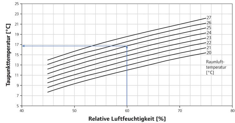 Um Schwitzwasserbildung an Anlagenkomponenten zu vermeiden, ist eine taupunktgeführte Vorlauftemperaturregelung vorzusehen.