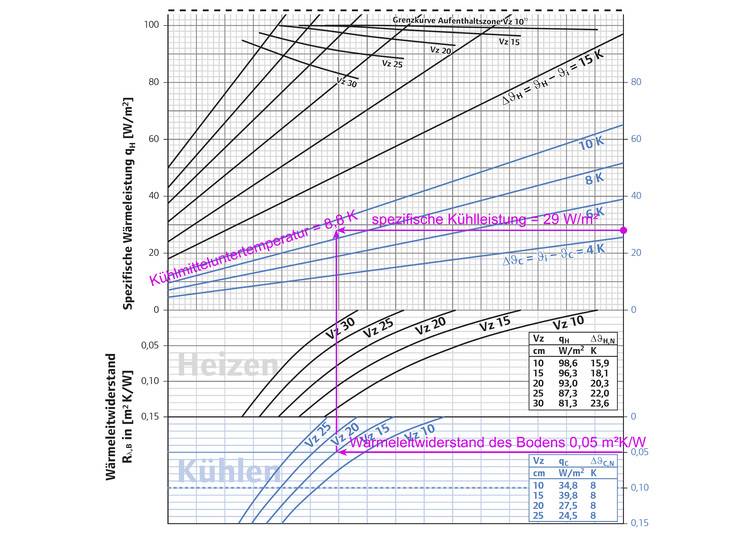 Und Hersteller von Systemen zur Flächenkühlung bieten abgespeckte, sehr leicht ablesbare Diagramme an, die wir als Beispiel hier präsentieren.