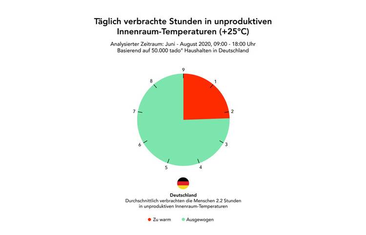 Bietet Home-Office in vielen Bereichen Vorteile, hat es im Sommer bei sehr hohen Temperaturen häufig einen entscheidenden Nachteil. Denn während Klimaanlagen in Büros relativ weit verbreitet sind, verfügt nur ein kleiner Prozentsatz der Privathaushalte über eine Klimaanlage. Die neue tado°-Studie zeigt, dass die Deutschen im Sommer 2020 durchschnittlich 15 Stunden pro Woche bei Temperaturen von 25 °C und mehr verbringen. (2)