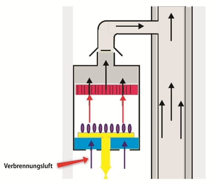 Verbrennungsluft raumluftabhängig (Heizlast 100 W/m², Luftbedarf 1,6 m³/h je kW):