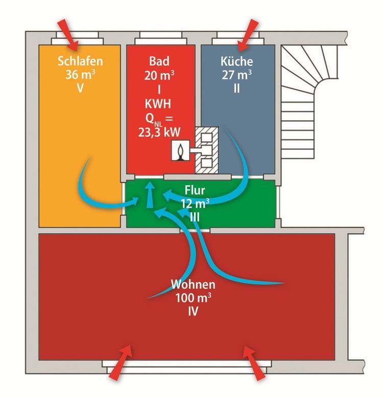 Erfolgt im Zuge einer Sanierung des Wohngebäudebestandes ein Ersatz der in der Wohnung aufgestellten Etagenheizung durch eine gebäudezentrale Wärmeversorgung (z. B. bei Einsatz von Wärmepumpenheizungen), ist keine Verbrennungsluft in der Wohnung mehr erforderlich. Dadurch entfällt in aller Regel deren Nachströmung in den Aufstellungsraum der bisherigen Etagenheizung durch den Raumluftverbund. Zudem werden häufig neue Fenster eingesetzt und die Wohnung wird dichter.