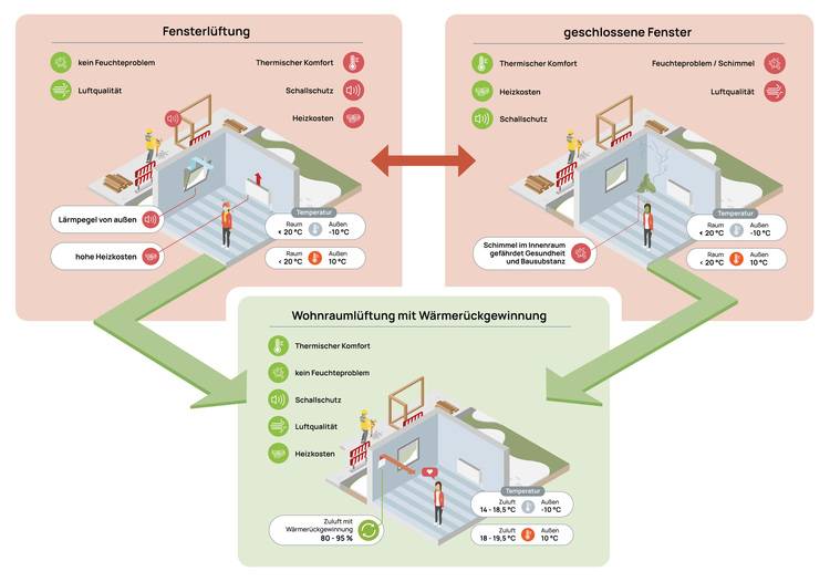 Durch eine ventilatorgestützte Lüftung, insbesondere mit Wärmerückgewinnung, lassen sich die Lüftungswärmeverluste reduzieren und gleichzeitig die Gesundheit der Bewohnerinnen und Bewohner und der Feuchteschutz des Gebäudes sicherstellen. Ein wichtiger, aber häufig wenig beachteter Aspekt ist dabei das Zusammenspiel von Heizsystem und Gebäudelüftung. Für den Gebäudebestand typisch sind heute mit Erdgas oder Heizöl beheizte Wohnungen (ca. 75 % des Gebäudebestandes), die sehr häufig nicht über Lüftungstechnik verfügen und folglich nur über Fugen bzw. Undichtigkeiten und/oder mit geöffneten Fenstern gelüftet werden.