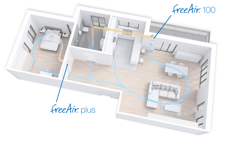 Zuluft-Räume wie das Schlafzimmer werden mit dem intelligenten aktiven Überströmer freeAir plus ganz ohne Leitungen an die Wohnraumlüftung angebunden. Der Zwischenwandlüfter vergleicht mithilfe von Temperatur-, Feuchte und VOC-Sensoren die Luftqualität des jeweils angeschlossenen Raumes (z. B. Schlafzimmer) mit der des Außenluftraumes (z.B. Flur) und sorgt zum richtigen Zeitpunkt für die Weiterleitung der frischen Luft.