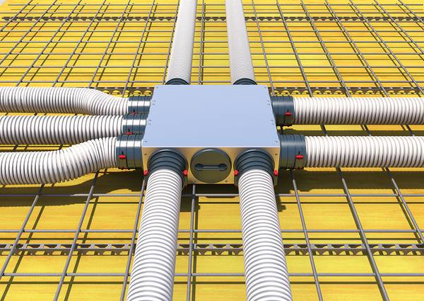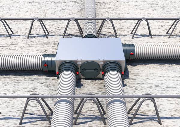 So können Lüftungsrohre durch das besonders kompakte Verteil-Element nicht nur flexibler in der Betondecke von Ein- oder Mehrfamilienhäusern verlegt werden, sondern auch schneller und dadurch kostengünstiger. Dies liegt insbesondere daran, dass ein kompliziertes Ein- und Ausfädeln der Lüftungsrohre aus der Decke entfällt. Zudem kann FRS-VE dank integriertem Höhenausgleich nicht nur in Filigrandecken verschiedener Stärke, sondern auch in Ortbetondecken eingebaut werden.