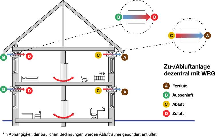 Dezentrale Lüftungsgeräte mit Wärmerückgewinnung (WRG) versorgen einzelne Räume unabhängig voneinander oder wirken im Verbund raumübergreifend miteinander.