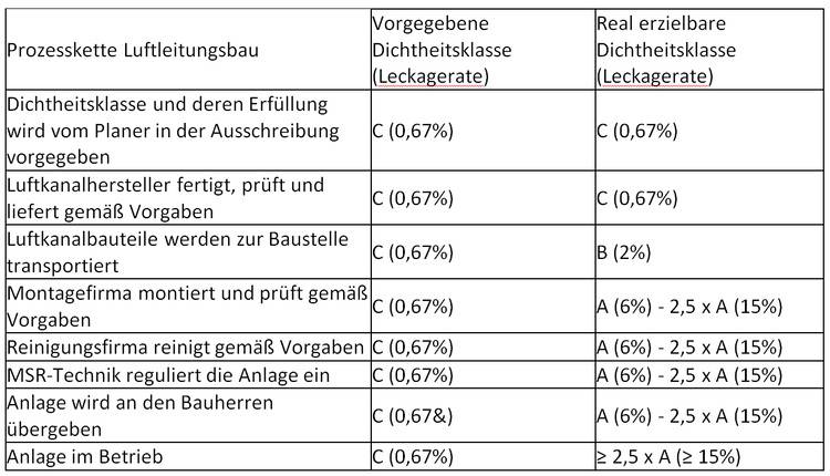 Zusammengefasst bedeutet dies, dass nahezu jeder einzelne Schritt der Prozesskette im Luftleitungsbau die Qualität und damit die Dichtheit des gesamten Luftleitungssystems negativ beeinflussen kann (s. Tabelle 1). Wird also beispielsweise die Dichtheitsklasse C (= 0,67% Leckagerate) ausgeschrieben, lässt sich prozessbedingt ohne eine nachträgliche Abdichtung in der Praxis meist bestenfalls Dichtheitsklasse A (= 6% Leckage-Rate) erreichen. Da jedoch vielmals nur die Mindestanforderung der Dichtheitsklasse B in den Ausschreibungen von (öffentlichen) Auftraggebern oder Planern gefordert wird, liegen die Leckage-Raten im Betrieb in aller Regel bei 15% und mehr. Folglich werden Luftleitungssysteme damit genau genommen entgegen der selbst erlassenen Anforderungen bei einer nicht mehr definierten Dichtheitsklasse betrieben, die 2,5-Mal der schlechtesten Dichtheitsklasse A entspricht. In der Konsequenz bedeutet dies erhebliche Energie- und Effizienzverluste sowie unnötig hohe Kosten und zahlreiche weitere Nachteile.