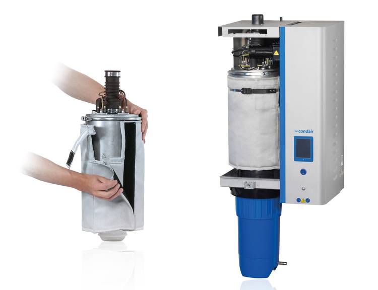 Dampfluftbefeuchter Condair RS nutzen korrosionsfreie Edelstahl-Zylinder, in denen mittels Heizstäben das Befeuchtungswasser erhitzt wird. Auch der Zylinder selbst erhitzt sich dabei. Die ergänzende Zylinderisolation der ECO+ Manschette hilft dabei die Wärmeabstrahlung des Dampfzylinders um bis 80% zu reduzieren.