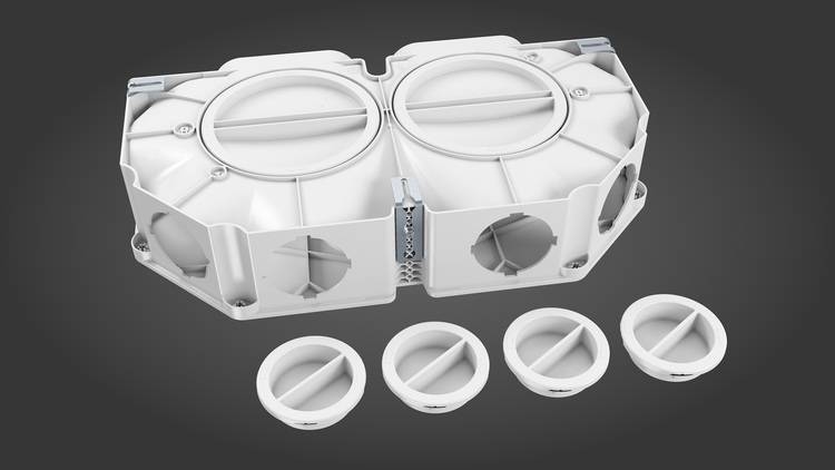 Der erste Kunststoffverteiler zur Installation in Beton schafft weitreichende Flexibilität auf der Baustelle. Für Ortbetondecken hat Fränkische ein einzigartiges Befestigungssystem entwickelt: Dort lässt sich der Flachverteiler mit dem Betonschalungsdeckel DN160 aus dem profi-air Betonschalungsset DN160 schnell, einfach und sicher anbringen. Geeignet für den Wohnungs- und Nichtwohnungsbau, Ein- und Mehrfamilienhäuser, Fertighäuser, Renovierungen sowie die Stockwerksverteilung, vereinfacht der profi-air Flachverteiler 6-fach die Lüftungsplanung für den Installateur. Dieser benötigt nur noch einen Verteiler für alle Anwendungen und profitiert von einer geringeren Lagerhaltung, genauso wie der Großhandel.