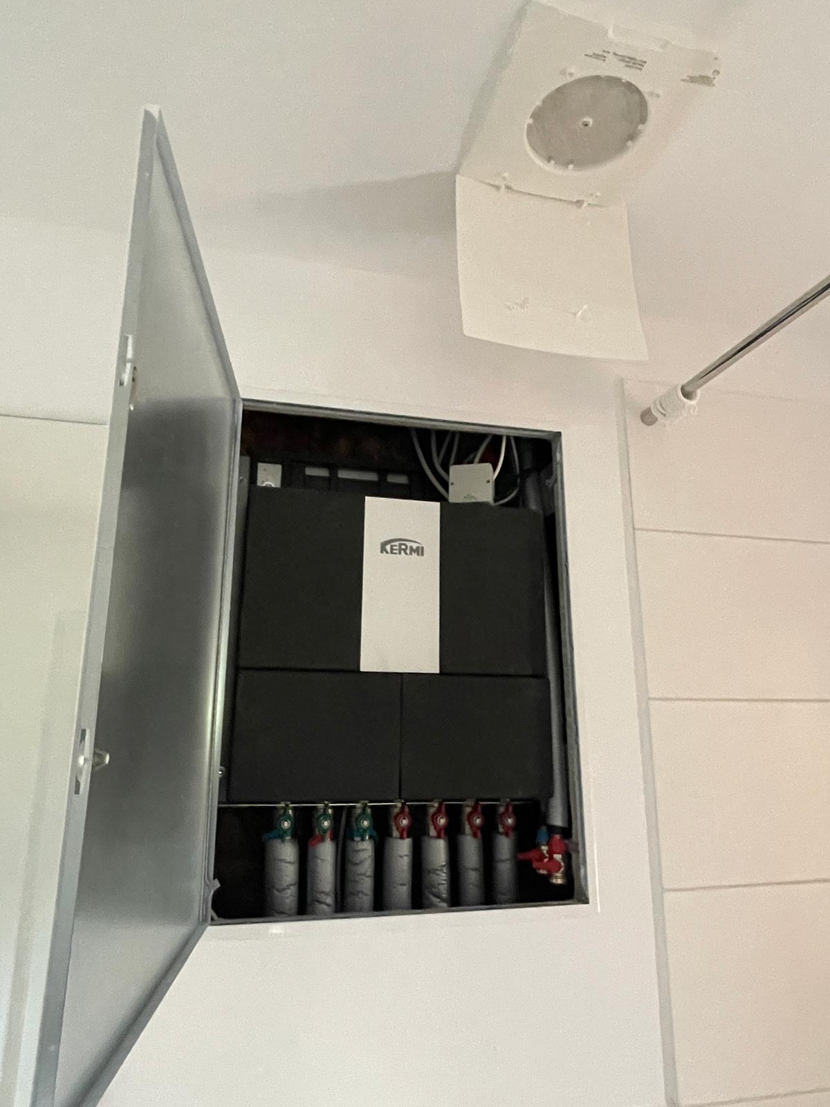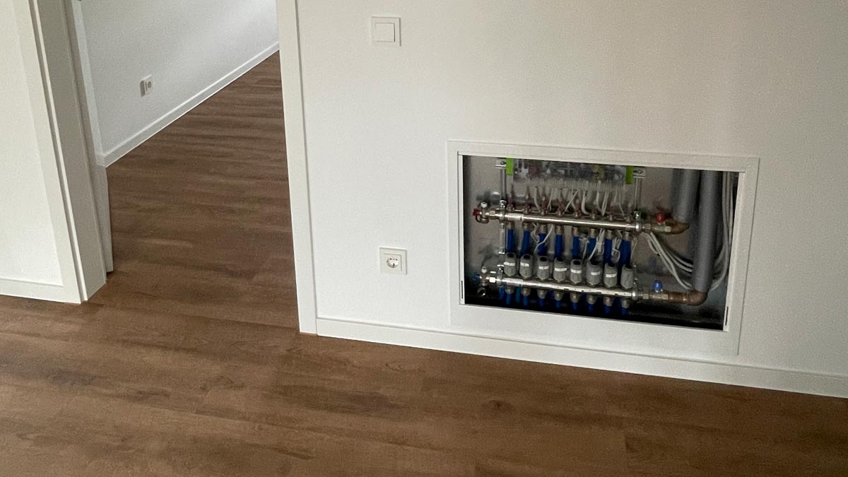 In Zusammenarbeit mit der Kermi-Anwendungstechnik wurde eine spezielle Wohnungsstationsgrundplatte entworfen. Diese verringert den Montageaufwand erheblich und gewährleistet eine sichere Installation. An den in der Wohnungsstation integrierten gemischten Heizkreis wurde der im Flurbereich positionierte Flächenheizungsverteiler angebunden.