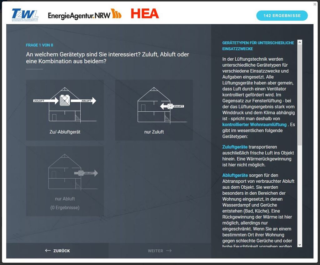 Acht aufeinanderfolgende Fragen führen den Nutzer gezielt zu der Gerätevariante, die für sein Projekt passend sein könnte. Neue Grafiken und Hilfetexte helfen bei der Beantwortung der Fragen. Die Suche wurde außerdem „mobile first“ gestaltet, ist also auf Smartphones und Tablet-PCs voll einsatzfähig. Mit optionalen Fragen, z.B. nach einem Passivhauszertifikat, kann die Suche verfeinert werden.