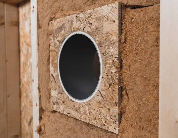 Dank des vorgefertigten Wandeinbausystems aus Holzmaterialien ist der Einbau der Inventer-Lüftung im Holzrahmen- und Holzständerbau unkompliziert. Auf der Baustelle wird die Wandeinbauhülse in die runde Öffnung im Woodplex eingeschoben und mit Montagekleber fixiert. Eine Kernlochbohrung ist somit nicht mehr nötig. Nach Abschluss der Wandarbeiten wird die Lüfter-Einheit wie gewohnt installiert.