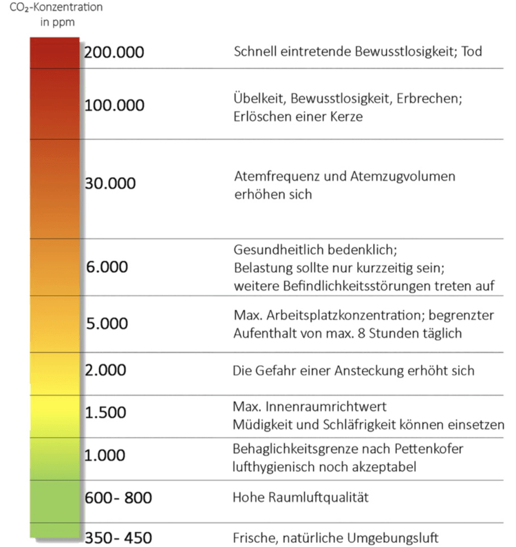 Lange Zeit galt die sogenannte Pettenkoferzahl, 1 000 ppm (0,1 Prozent), als Indikator und Grenzwert für gute Raumluftqualität. Noch heute dient sie als wichtige Zielgröße. Denn ab dieser Menge können bereits Merkmale von Unwohlsein durch zu hohe CO2-Konzentration in der Luft wie Kopfschmerzen, Konzentrationsschwäche und Müdigkeit auftreten.
