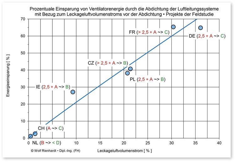 Die bei einem ganztägig laufenden Ventilatorsystem erzielbaren Einsparungen durch eine geringere Ventilatorleistung liegen in Abhängigkeit der Größe der abzudichtenden Luftleitungsfläche, der Nennleistung des Ventilators und der Leckageraten (vor und nach der Abdichtung) zwischen 5.000 und 331 .00 kWh/a bzw. rund 900 und 36.000 Euro pro Jahr.