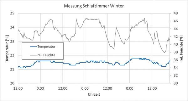 Im Schlafzimmer - hier halten sich in der Regel zwei Erwachsene auf - steigt während der Nacht in der betrachteten Messperiode Anfang Februar ab dem Zeitpunkt der Raumbelegung und -nutzung die relative Raumluftfeuchte von ca. 40 auf bis zu 50 Prozent. Die von den Menschen erzeugte feuchtere Luft wird während der Nacht zum Abluftbereich transportiert. Dort erfassen wiederum die mechanischen Feuchtesensoren der Abluftelemente einen Feuchtigkeitsanstieg, welcher dazu führt, dass die Anlage den Abluftvolumenstrom erhöht. Während dieser Zeit bleibt die Raumtemperatur um die 21,5 °C konstant (min.: 21,1 °C / max.: 21,8 °C). Während der untersuchten Messperiode betrugen die gemessenen Außentemperaturen 1 bis 6 °C. Messpunkt war der ungeschützte Bereich auf dem Balkon, der in Südwestrichtung angeordnet ist.