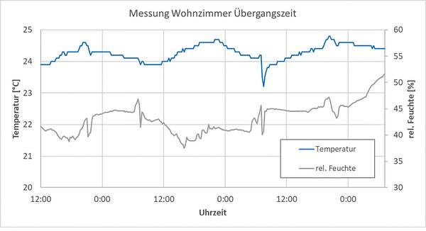 Feuchtegeführte Außenluftdurchlässe (ALD) ermöglichen einen Luftaustausch basierend auf der Messung der relativen Raumluftfeuchte. Im Diagramm ist zu sehen, wie bei gleichbleibender Raumtemperatur (ca. 24 °C) die relative Raumluftfeuchte zwischen 40 und 50 Prozent variiert. Deutlich zu sehen ist nach dem Steigen der Raumluftfeuchte ein entsprechendes Absinken dieser Werte. Dies deutet auf eine höhere Frischluftzufuhr in Zeiten von Belegung und Nutzung des Raumes hin, nämlich morgens und abends.