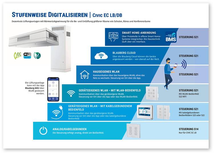 Ergänzt werden die Anlagen in Kirchberg mit Sensoren, welche die CO2-Konzentration im Raum automatisch messen. Sobald gewisse Grenzwerte überschritten werden, regelt sich die Lüftung selbstständig hinauf oder hinunter. Auf diese Weise lässt sich die Steuerung der Ventilatorleistung in Übereinstimmung mit der CO2-Konzentration sowie der personellen Raumauslastung regeln, ohne dass das Schulpersonal aktiv werden muss. Wenn nötig, können die WLAN-fähigen Anlagen aber auch manuell über das externe Bedienfeld S22, S25 oder die App individuell gesteuert werden.