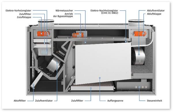 Beim Lüftungsgerät Civic DB liegt der Fokus darauf, eine hohe Raumluftqualität sicherzustellen und gleichzeitig die Heiz- und Energiebilanz der Schule zu verbessern. Hierzu verfügen die Geräte über ein wärme- und schallisoliertes Gehäuse, EC-Ventilatoren mit niedrigem Stromverbrauch und hoher Leistung sowie einem Wärmeübertrager aus Polystyrol. Zuluft-Panelfilter verhindern das Einströmen ungewollter Verschmutzungen in den Raum und Abluftfilter schützen den Wärmeübertrager vor einem Leistungsabfall, den eine Partikelansammlung verursachen würde.
