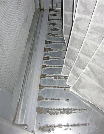 Taschenfilter, die bei abgeschaltetem Ventilator auf dem Geräteboden aufstehen, verursachen bei Feuchteeintrag in den Filtertaschen Korrosion. Dies tritt insbesondere auf, wenn die Geräte längere Zeit nicht betrieben werden. Bei Aufstellung im Freien und einer längeren Zeit bis zur Inbetriebnahme kommt es häufig zur Schwitzwasserbildung, auch in der Filterkammer. Da die Filter sich mangels Luftstrom nicht bewegen, trocknet das Kondensat nicht ab, sondern die linienförmige Berührungsfläche zwischen Filtertasche und Geräteboden bleibt ständig feucht. Korrosion ist die Folge (Bild 1).
