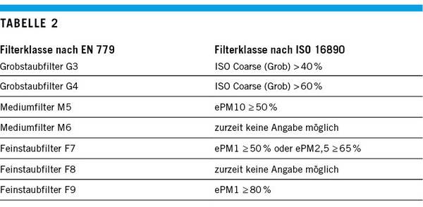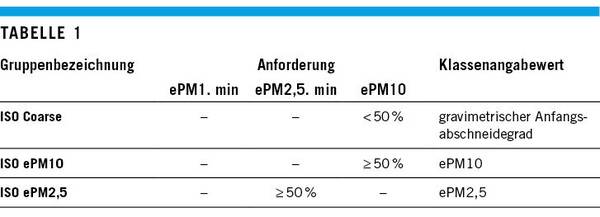 Derzeit werden die Prüfnormen und die Qualifizierungen von Luftfiltern von der EN 779 auf die DIN EN ISO 16890 umgestellt, die seit August 2017 als Weißdruck vorliegt und somit gültig ist. Die neue Norm bewertet, anders als die EN 779, die Wirksamkeit von Luftfiltern gegenüber den verschiedenen Feinstaub-Fraktionen PM1, PM2,5, PM10 und Coarse (Feinstaub bis 1 m, bis 2,5 m, bis 10 m und Grobstaub). Diese PM-Werte (Particulate Matter = Feinstaub) werden analog auch in der Bewertung der Außenluftqualität verwendet (Tabelle 1).