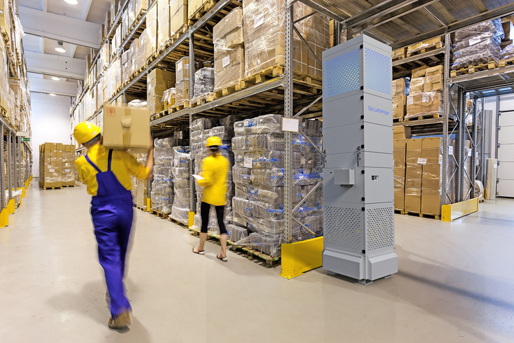 In einer Höhe von rund 3 m wird die kontaminierte Luft in einem Radius von bis zu 30 m angesaugt und durch eine UV-C-Bestrahlungssektion geleitet. Abgetötete Keime größer 0,1 µm werden zu 99,995 Prozent vom H 14-Schwebstoffilter aufgenommen. Die saubere Luft wird über die Luftauslässe in Bodennähe nahezu geräuschlos wieder in die Halle zurückgeführt. Der Luftreiniger kann mittels Kranösen und Staplerkufen innerhalb der Halle sinnvoll positioniert werden. Die H 14-Filterkassette und die UV-C-Leuchte lassen sich bei Bedarf komfortabel über Wartungstüren entnehmen.