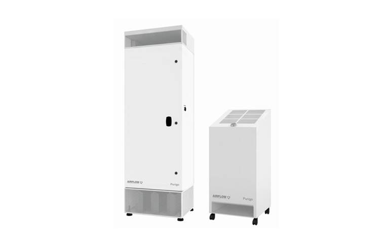 Airflow bietet mit der Luftreiniger-Serie Purigo eine schnelle Lösung zur Minderung der Virenlast. Die Luftreiniger-Geräte kommen überall da zum Einsatz, wo eine ausreichend nötige Frischluftzufuhr nicht gewährleistet werden kann. Sie haben ein mehrstufiges Filtersystem mit hochwertigem HEPA H14-Filter, der auch kleinste Partikel zu 99,995 % aus der Luft entfernen kann. Die Geräte sind robust und auf den Dauerbetrieb ausgelegt, zugleich arbeiten sie leise und energiesparend. Mit maximalen Volumenstromleistungen von 650 bis zu 2.200 m³/h führt Airflow sowohl feststehende Standgeräte als auch rollbare Mobilgeräte im Portfolio.