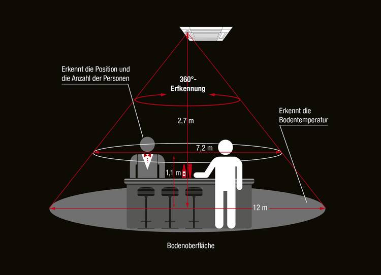 Bestes Beispiel dafür ist der neue 3D i-see Sensor, der Personen im Raum und ihre jeweilige Position genau erkennt. Gleichzeitig erfasst er auch die Raumtemperatur in einem Umkreis von 12 Metern zuverlässig in insgesamt 1.856 einzelnen Sektoren. Marktüblich ist ansonsten die Messung der Bodentemperatur an einem einzigen Punkt. Die Daten werden in Echtzeit verarbeitet und sind die Grundlage für die Ausblastemperatur sowie die Luftverteilung im Raum. Ändert sich beispielsweise die Anzahl der Personen im Raum, passt der 3D i-see Sensor automatisch die Kühl- oder Heizleistung an. Halten sich eine bestimmte Zeit keine Menschen im Raum auf, schaltet das Innengerät selbstständig in einen vorab festgelegten Stand-by-Modus. Dadurch werden die Energiekosten noch weiter reduziert.
