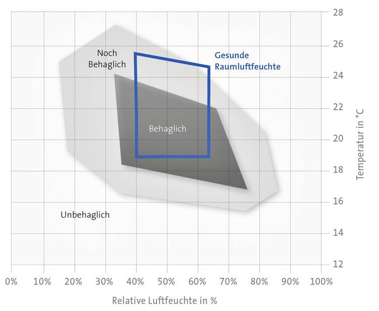 Das in der Klimatechnik seit vielen Jahren etablierte Diagramm mit Vorgaben zu behaglichen und gesunden Raumluftfeuchten spiegelt die Forderungen nach einer Mindestraumluftfeuchte von etwa 35 bis 40 % in Abhängigkeit von der Raumtemperatur im Feld „behaglich“ durchaus wider. Doch diese Werte finden in der Normung und auch in der täglichen Praxis der Lüftungs- und Klimatechnik bislang noch zu wenig Beachtung und sollten konsequenter umgesetzt werden.