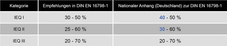 Aus dem Tabellentitel „wenn Be- oder Entfeuchtungsanlagen eingebaut sind“ folgt, dass die Minimal- und Maximalwerte nur dann eingehalten werden können, wenn in der Lüftungs- oder Klimaanlage tatsächlich Systeme zur Be- und Entfeuchtung installiert sind. Grundsätzlich sind aber alle Parameter der IEQ, und dazu gehört auch die Raumluftfeuchtigkeit, im Rahmen des Planungsprozesses festzulegen und zu dokumentieren. Eine entsprechende Diskussion und Aufklärung der Kunden und Nutzer ist also erforderlich.