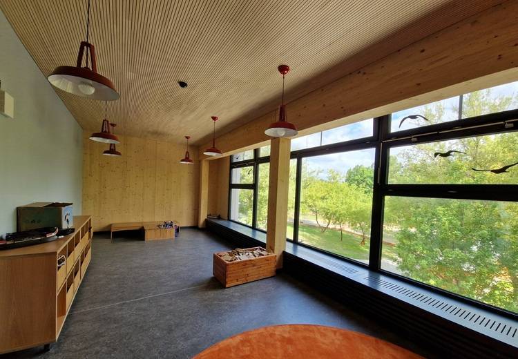 Die meisten Räume des Hortes verfügen zudem zusätzlich über manuell zu betätigende Fenster. So können die Gebäudenutzer das Raumklima bei Bedarf spontan auch eigenständig regeln.