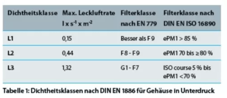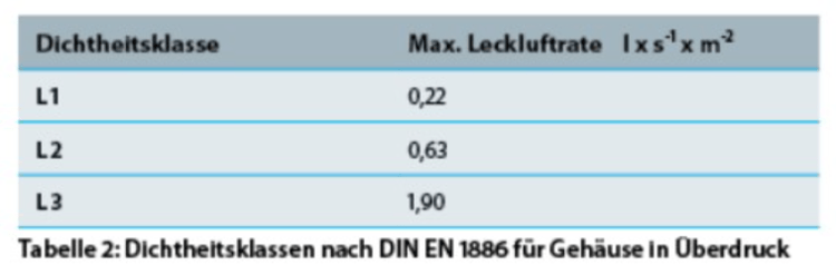 Die Leckluftrate wird hier bei einem Unterdruck von 400 Pa ermittelt. Die Einteilung der Gehäuse erfolgt in Dichtheitsklassen: