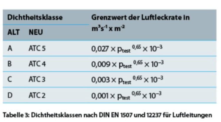 Die Anforderungen an die Dichtheit für rechteckige Luftleitungen ist in DIN EN 1507 festgelegt, jene für runde Luftleitungen in DIN EN 12237. Die zwei Normen gelten jeweils für Luftleitungen aus Blech. In beiden Normen wird eine Einteilung in Luftdichtheitsklassen von A bis D durchgeführt. In DIN EN 16798-3 (Energetische Bewertung von Gebäuden - Lüftung von Nichtwohngebäuden) wird als Mindestdichtheitsklasse für Luftverteilungsanlagen die Klasse B vorgegeben, empfohlen wird jedoch Klasse C. Darin ist neben den Bezeichnungen der Dichtheitsklassen aus DIN EN 1507 und 12237 auch bereits die neue Bezeichnung ATC angegeben.