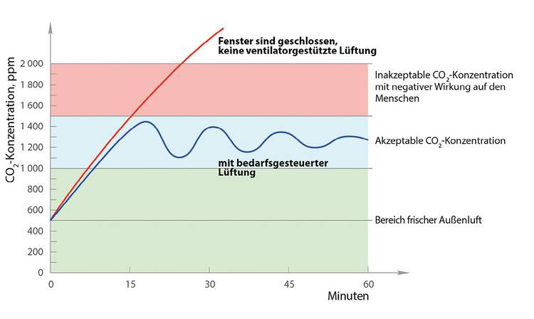 Sowohl häufiges Stoßlüften als auch Luftreinigungsgeräte sind kein Allheilmittel und bringen einige Nachteile mit sich. Besonders in Räumlichkeiten von Schulen und Bürogebäuden ist es wichtig, die verbrauchte, CO2-belastete Luft regelmäßig durch frische zu ersetzen. Der Bedarf pro Person im Raum liegt bei rund 20 bis 30 m3 Frischluft pro Stunde. Andernfalls nimmt die Konzentrations- und damit auch die Leistungsfähigkeit ab, oftmals begleitet von weiteren Beschwerden wie beispielsweise Kopfschmerzen. Außerdem kühlt das Gebäude vor allem in der kälteren Jahreszeit durch das regelmäßige Fensteröffnen aus, was wiederum zu höheren Heizkosten führt. Zudem begünstigen die starken Temperaturschwankungen Erkältungskrankheiten.