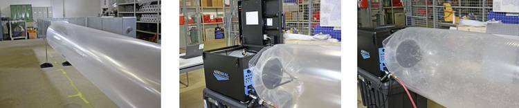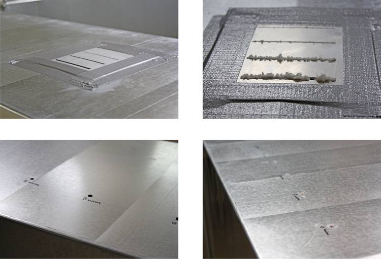 Die Bilder (unten) zeigen einen Versuchsaufbau: Die Luft wird über einen Schlauch in den Lüftungskanal geführt. In der Aeroseal-Maschine befinden sich ein Ventilator sowie die Einspritzdüse für den Dichtstoff. Das Ende des Kanals wird mit je nach beaufschlagtem Druck mit Schaumstoff, Blech oder Folie verschlossen.