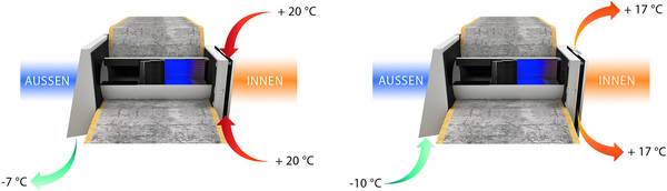 Bei kalten Temperaturen empfiehlt es sich, den Wärmerückgewinnungsmodus einzuschalten, um unnötige Energieverluste zu vermeiden. Dafür wird in jeder Anlage ein keramischer Enthalpie-Wärmeübertrager verbaut. Die Lüftungssysteme wurden so konstruiert, dass sie sowohl im Zu- als auch im Abluftbetrieb eingesetzt werden können. Im Wärmerückgewinnungsbetrieb wechselt das Gerät nach jeweils 70s die Richtung.