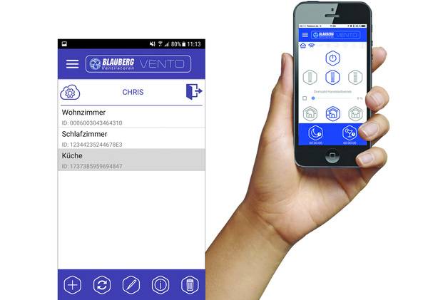 Beim Blauberg-System sind die Geräte über WLAN ansteuerbar und können nach der Installation per Laptop oder Computer mit USB-Schnittstelle beliebig in Gruppen eingeteilt werden. Diese lassen sich dann über eine App auf dem Smartphone oder Tablet bedienen. Die Anwendung steht sowohl für Android als auch für iOS zur Verfügung. Dabei muss kein externer Router vorhanden sein, denn jedes Lüftungsgerät verfügt über einen internen Router, sodass sich pro Gruppe vier Geräte zusammenschließen lassen. Wird ein externer Router verwendet, sind sogar bis zu 32 Lüftungskomponenten in einem Verbund möglich.