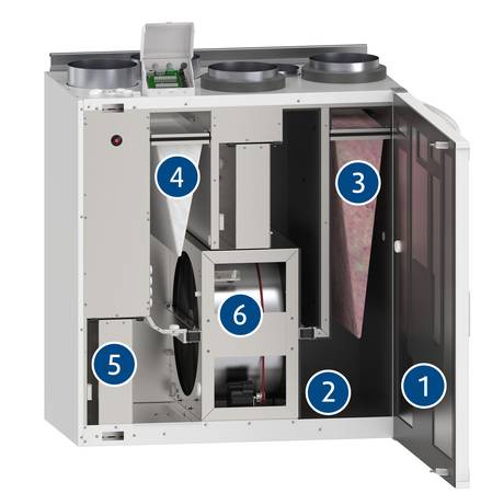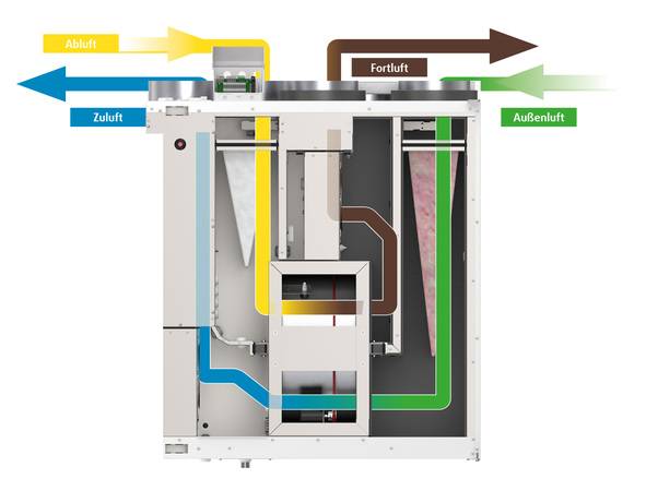 Eine kontrollierte Wohnungslüftung mit Wärme- und Feuchterückgewinnung sorgt für ein gesundes Innenraumklima und hohe Energieeffizienz.