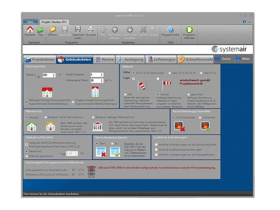 Nach Eingabe der Gebäudedaten ermittelt die Software, ob eine lüftungstechnische Maßnahme notwendig ist. Sollte nach DIN 1946-6 ein Lüftungskonzept erforderlich sein, schlägt das Programm automatisch passende Lüftungsgeräte sowie entsprechend notwendiges Zubehör vor. Hierbei besteht in der Regel die Möglichkeit zwischen verschiedenen passenden Lüftungsgeräten auszuwählen. So ist es dem Benutzer möglich, einfach und schnell das passende System zusammenzustellen.