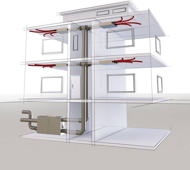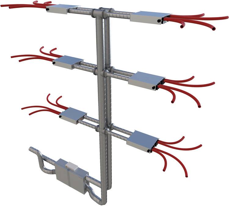 Auf der Raumseite lassen sich bis zu sieben ValloFlex-Luftverteilrohre (d = 75 mm) mit bis zu 30 m3/h je Lüftungsrohr anschließen. Für die Verlegung der Luftverteilung in der Aufbetonschicht einer Elementdecke steht eine Adapterplatte zum Einbetonieren in eine Fertigteildecke zur Verfügung.
