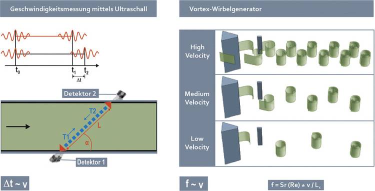 Bei einem Vortex-Generator wird die zur Strömungsgeschwindigkeit proportionale Ablösefrequenz der Wirbel detektiert. Beim Anemometer verhalten sich Drehzahl und Volumenstrom proportional.