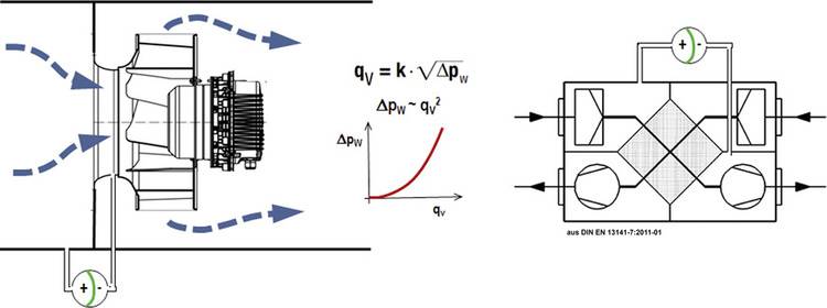 Für Abluftventilatoren in fensterlosen Bädern und Toiletten gilt beispielsweise die DIN 18017-3. Nach dieser darf sich der Abluftvolumenstrom bei einer Druckdifferenz von +/- 40 Pa bzw. +/- 60 Pa um maximal 15 Prozent ändern.