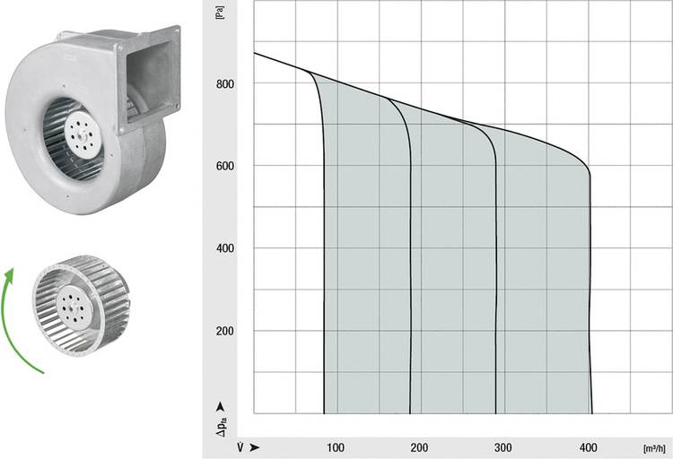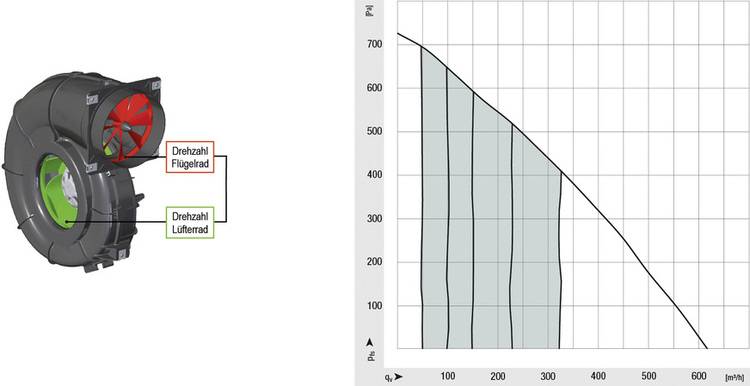 Diese Kennlinien-Charakteristik findet man nur bei vorwärtsgekrümmten Radiallaufrädern. Bei elektronisch kommutierten Gebläsen spricht man in diesem Zusammenhang oft von „sensorloser“ Regelung, weil nur interne Motorgrößen verwendet werden und keine externen Druck- oder Geschwindigkeits-Sensoren erforderlich sind.