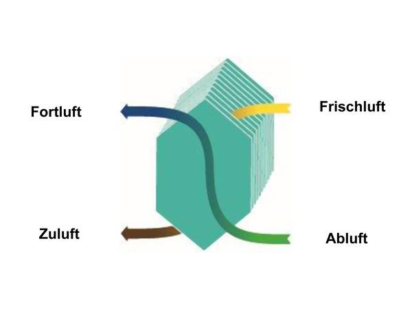 Beim Enthalpie-Verfahren werden zahlreiche schmale Zu- und Abluftkanäle durch Membranen abgegrenzt und gegenläufig durchströmt (Bild 2). Die Speichermasse der Membranplatten überträgt die Wärme der Abluft auf die Zuluft. Gleichzeitig diffundiert die Feuchtigkeit durch die Membranen.