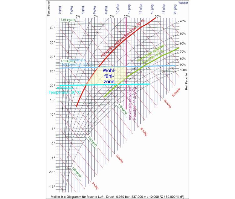 - Die relative Feuchte sollte zwischen 30 % und 65 % liegen. Diese Behaglichkeitszone und der Zusammenhang lässt sich sehr gut im h-x-Mollier-Diagramm darstellen:
