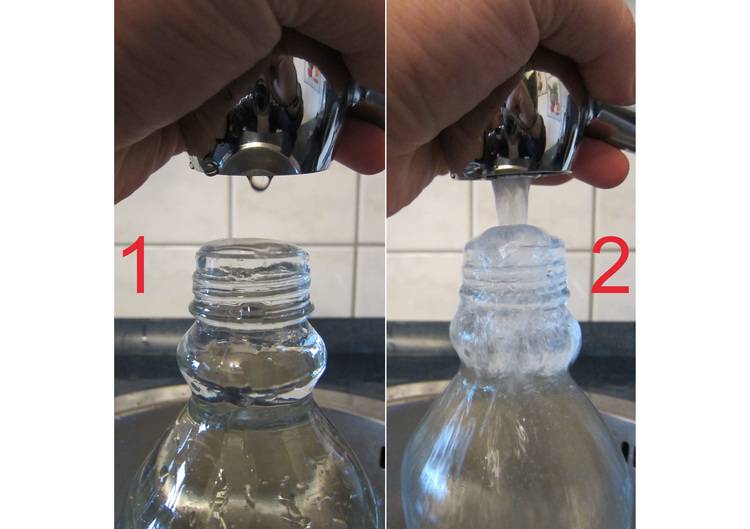 Ziel soll es sein, das Wasser in einer Glasflasche innerhalb von zwei Stunden möglichst vollständig auszutauschen. Die Glasflasche mit einem Volumen von genau einem Liter sollte am Ende der Prozedur möglichst frisches Wasser beinhalten.