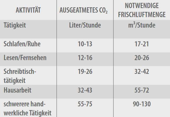 Bei Raumbelegung mit mehreren Personen in einem kleinen Wohnzimmer sinkt der O2-Gehalt auf bis zu 18 % und steigt der CO2-Gehalt auf bis zu 0,1%. Müdigkeit macht sich breit. Ein Erwachsener erzeugt zwischen 10 bis 75 l CO2 pro Stunde. Und obwohl CO2 nicht giftig ist, greift man intuitiv, nachdem die ersten Gäste bewusstlos umgefallen sind, zum Fensterknauf und lässt Frischluft hinein. Hoffentlich die entsprechenden Mengen der folgenden Tabelle.