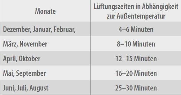 Um durchgreifend eine Änderung der Luftqualität zu erreichen, sollte der Vorgang des Lüftens per Fenster natürlich über eine gewisse Zeit erfolgen. Nur ist die Luftqualität der Außenluft stark schwankend. Im Sommer beispielsweise ist die Außenluft wegen der hohen Temperaturen absolut eher feucht, im Winter eher trocken. Daher hier ein Versuch, die Lüftungszeiten über das Jahr verteilt als Empfehlung zu beschreiben: